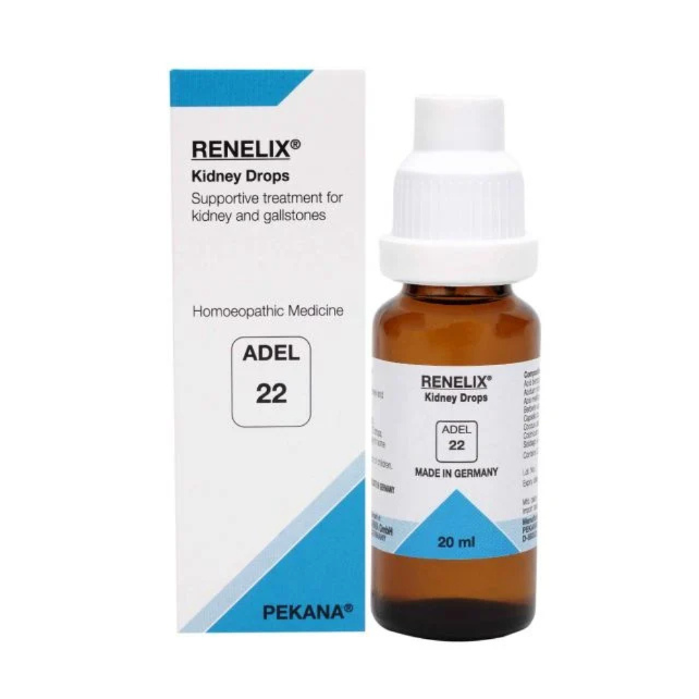 ADEL 22 (RENELIX) drops support the excretion of concrement (protein concretions, calculi) and toxins deposited in the kidney cells, and helps restore normal kidney function. ADEL 22 drops also help counteract intoxification through aging or illnesses that weaken metabolic  processes, which can result in hypertonia, diabetes or precancerous conditions such as arthritis and rheumatism. Finally, this remedy helps regulate toxic blockades in chronically ill patients, which allows systemic healing to take place.