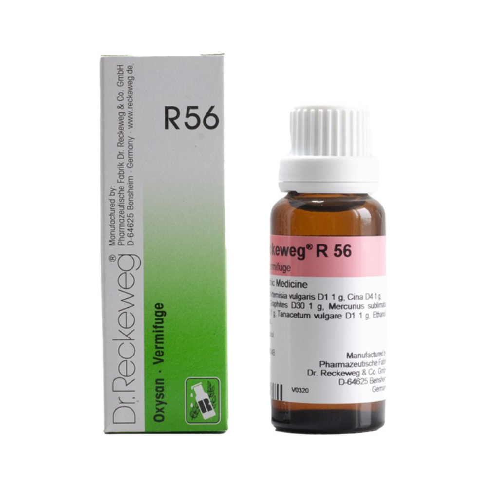 R 56 is not a fast acting vermifuge. Its indications are in particular to remove the concomitant symptoms of this parasitic complaint and to improve the constitution. In this way lasting cure from helminthes is possible and relapses are prevented. The symptomatology of the individual remedies is: