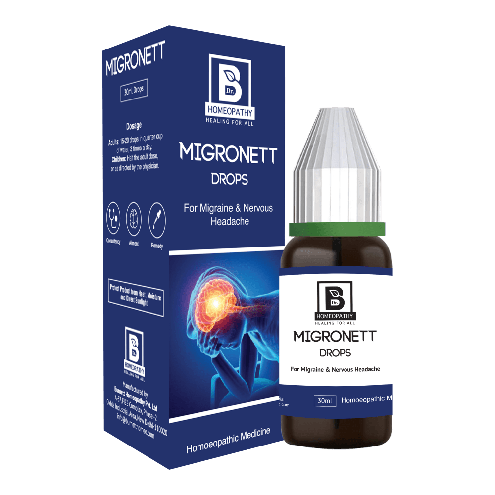 MIGRONETT DROPS is a combination of remedies that relieves pain in head, especially one sided. Indicated in cases of migraine, nervous headache, especially throbbing pain in one side of head, with nausea, vomiting & difficulty in vision, sensitivity to light.