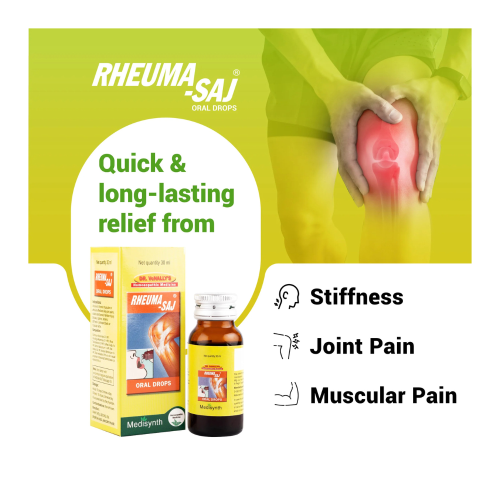 Rheumasaj Oral drops is a homoeopathic remedy for those suffering from muscle pain, joint pain, swelling and stiffness. The drops are great choice for a long term and ensures pain free mobility.