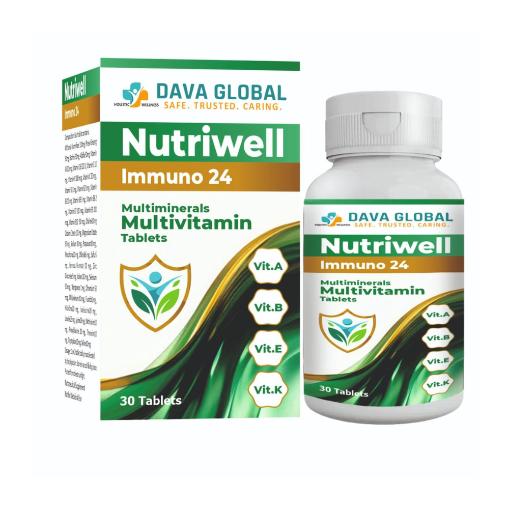 Nutriwell – Immuno 24 is a premium nutraceutical supplement formulated to provide comprehensive daily nutrition support. It delivers a balanced blend of essential vitamins, minerals, amino acids, and herbal extracts to help maintain overall health, energy, immunity, and vitality.