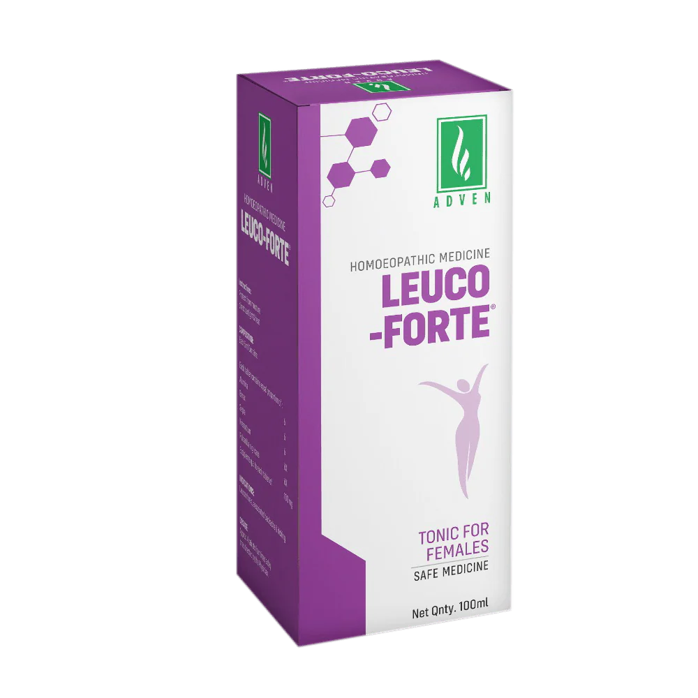 Adven’s Leuco-forte syrup is a potent uterine tonic for women, formulated with homoeopathic remedies that address whitish or yellowish vaginal discharge, vulvar itching, and general weakness. Leucorrhoea, characterized by excessive white, sticky, and foul-smelling vaginal discharge, may result from factors like poor hygiene, genital tract infections, or compromised immune function. Leuco-forte syrup is also beneficial in managing menstrual irregularities, back pain, cramps, nausea, and pelvic discomfort, including burning or cramping sensations.